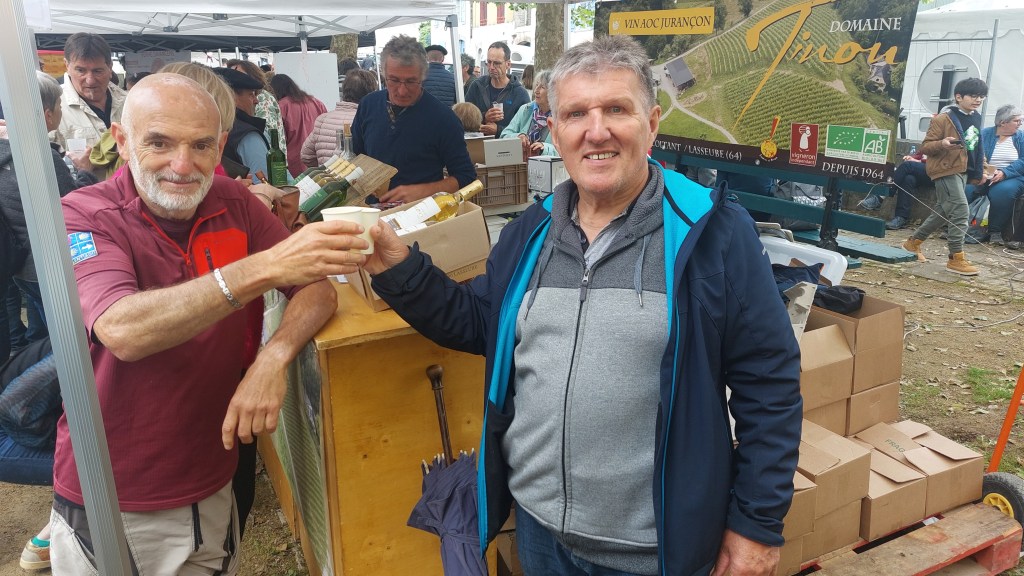 Avant de prendre le départ avec mon binôme, un passage obligatoire à la foire traditionnelle où les valeurs du terroir sont bien imprégnées afin de déguster le » Jurançon » dont on dit qu’au cours du baptême d’Henri IV, son grand-père Henri d’Albret présente ce vin au nouveau né pour effacer le goût de l’ail qui l’avait fait grimacer.