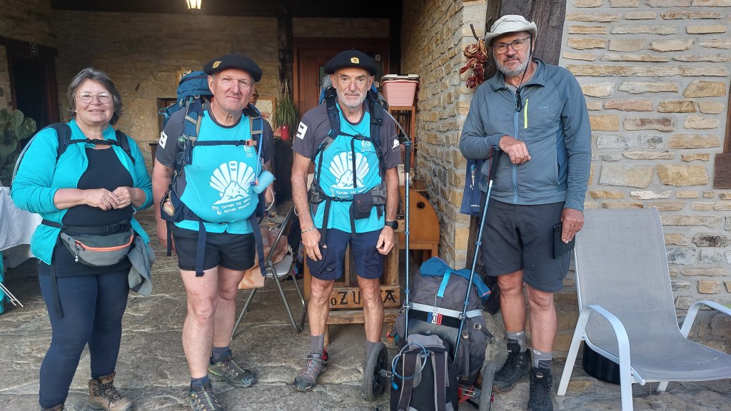 Avant notre départ, nous faisons une photo avec un couple de pèlerins qui partage leur vie entre le 78 et le 05. Parti de Bayonne, il effectue le chemin de Saint-Jacques avec une remorque ( tiré par le pèlerin) sur laquelle sont posés les sacs. Il éprouve certaines difficultés  dans certains chemins.