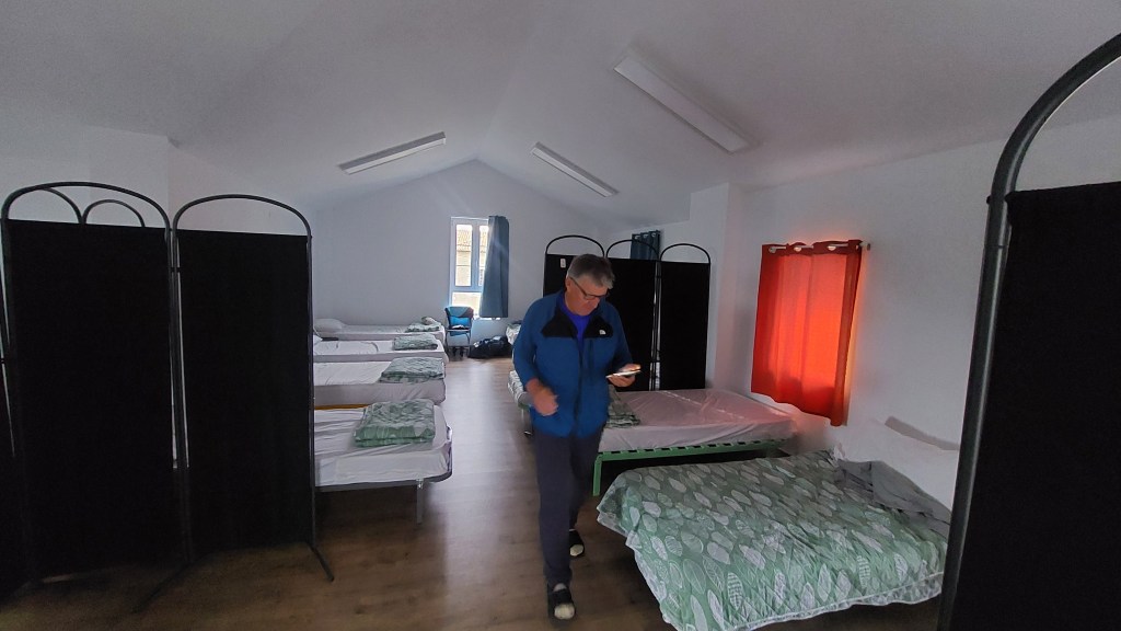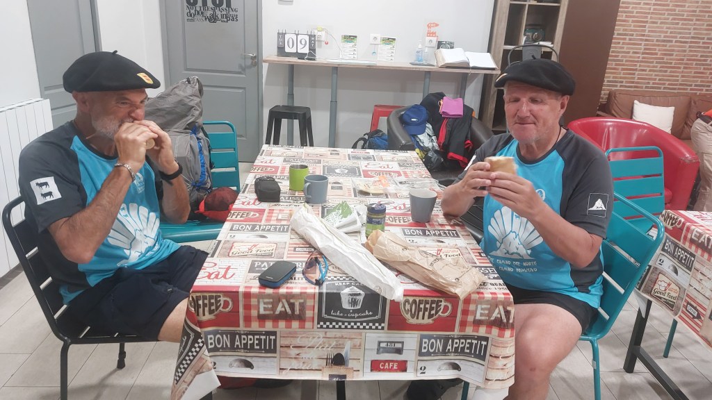 Afin de préserver nos forces, nous déjeunons d’une façon qui nous permet d’être bien calés : pain, pesto, jambon, fromage. Un café et une pâtisserie  nous sont offerts par l’albergué.