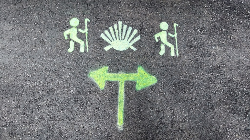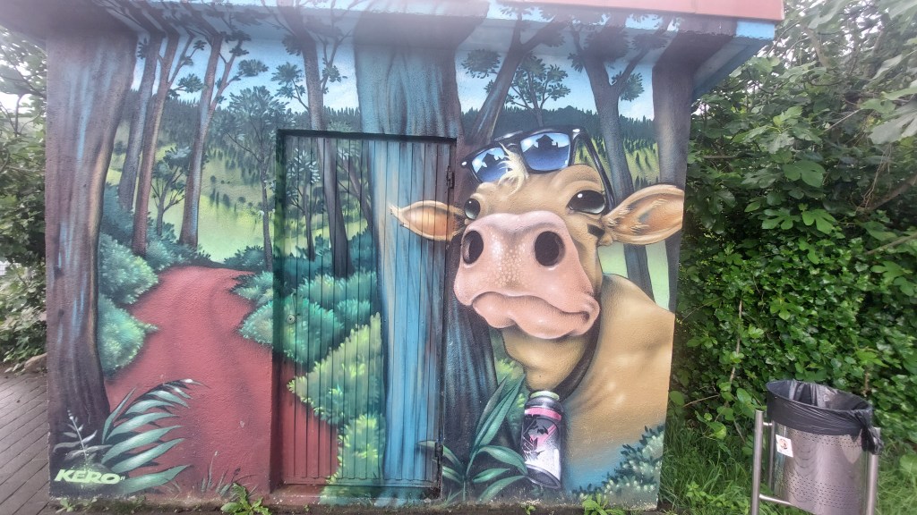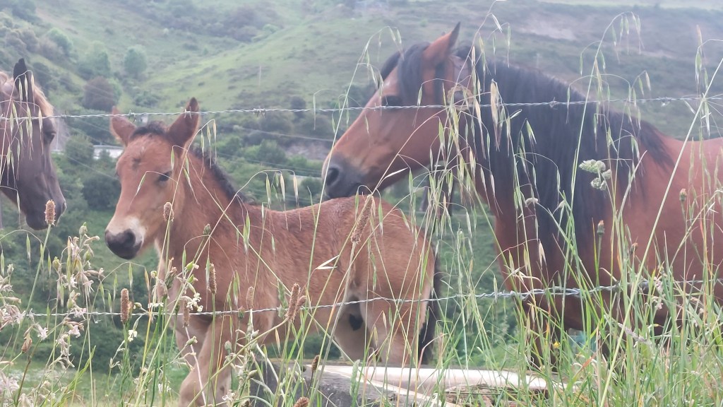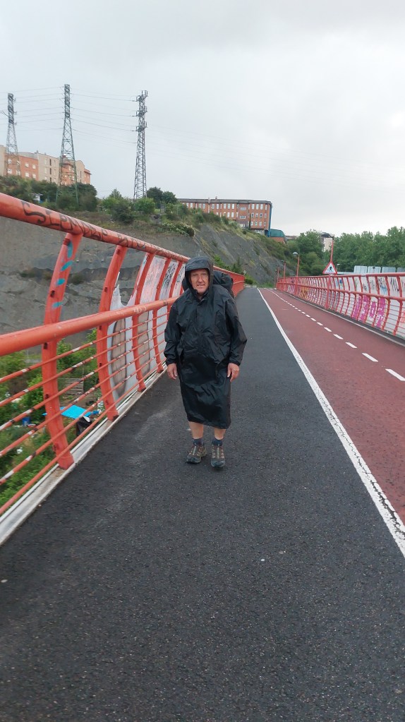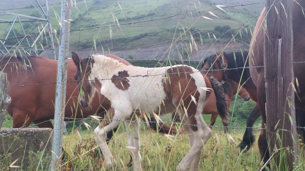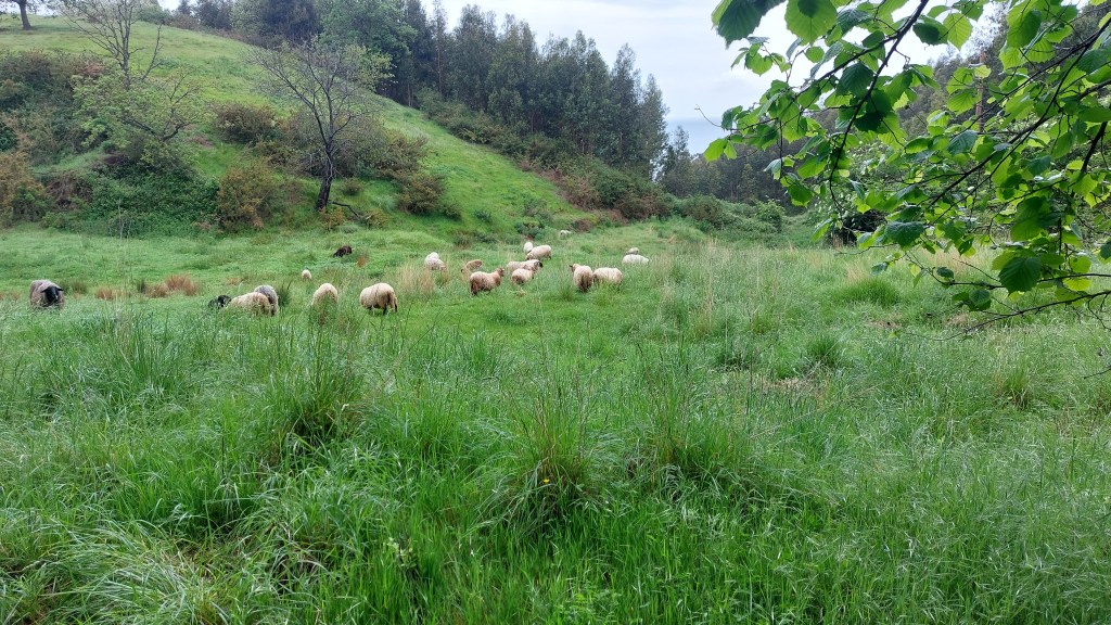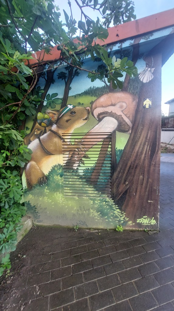 Nous quittons Portugalete sur une route partagée entre vélos et piétons  qui longe l’autoroute. Nous laissons cet environnement qui devient plus campagnard. Nous marchons entre animaux et art urbain.