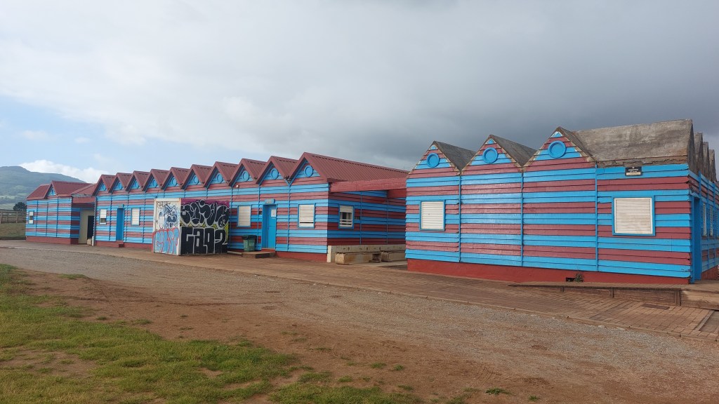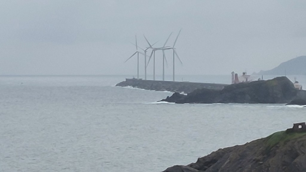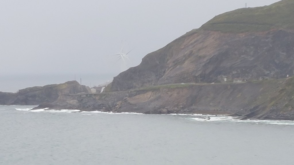 Le bleu du ciel se change en gris et les gouttes nous rappellent à  l’ordre. Nous longeons l’océan  decoupé en larges falaises abruptes.