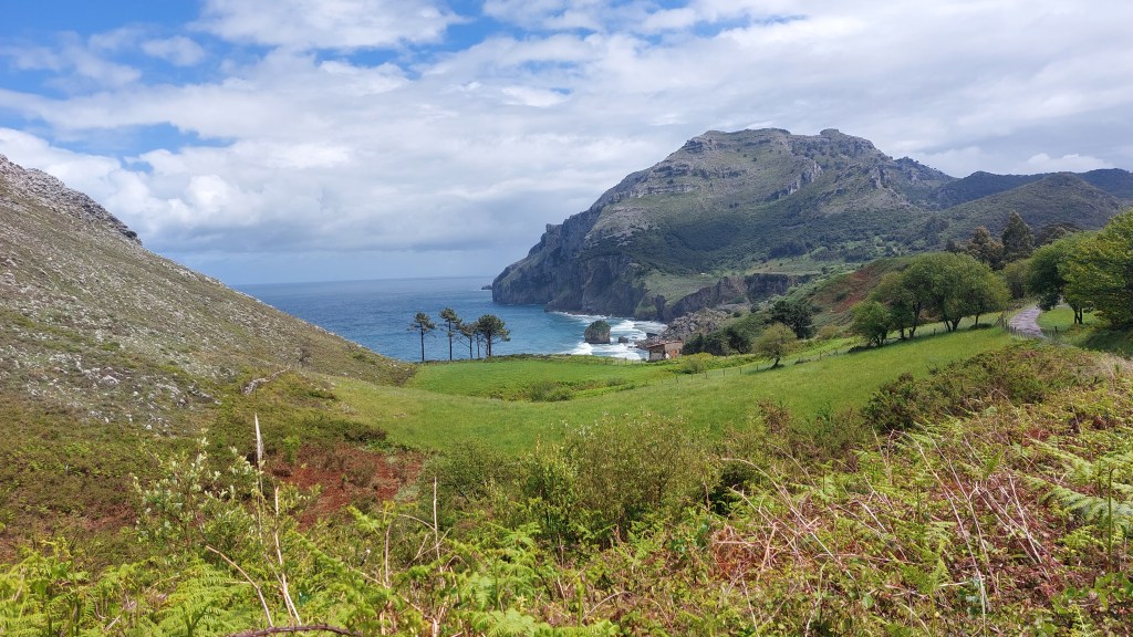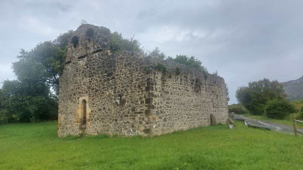 Liendo, une flèche jaune : nous sommes sur le bon chemin. Nous prenons le sentier côtier qui par une piste boueuse et caillouteuse qui nous amène aux ruines de l’hermitage San Júan.