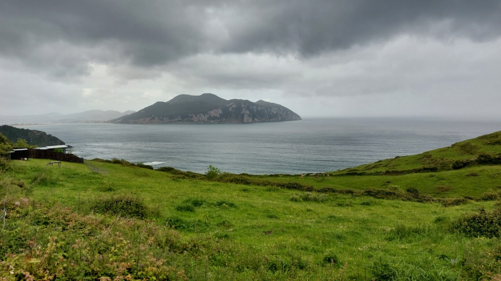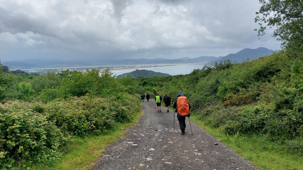 L’ultime montée se fait toujours sous la pluie et emprunte un sentier à vaches boueux et glissant. Une dernière descente cimentée et particulièrement glissante nous fait rejoindre Laredo.