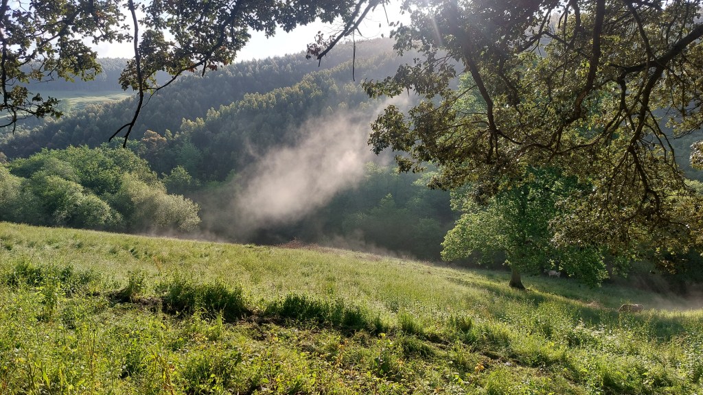 Départ à  7h50. Le soleil illumine la campagne; toutefois la température est fraîche.