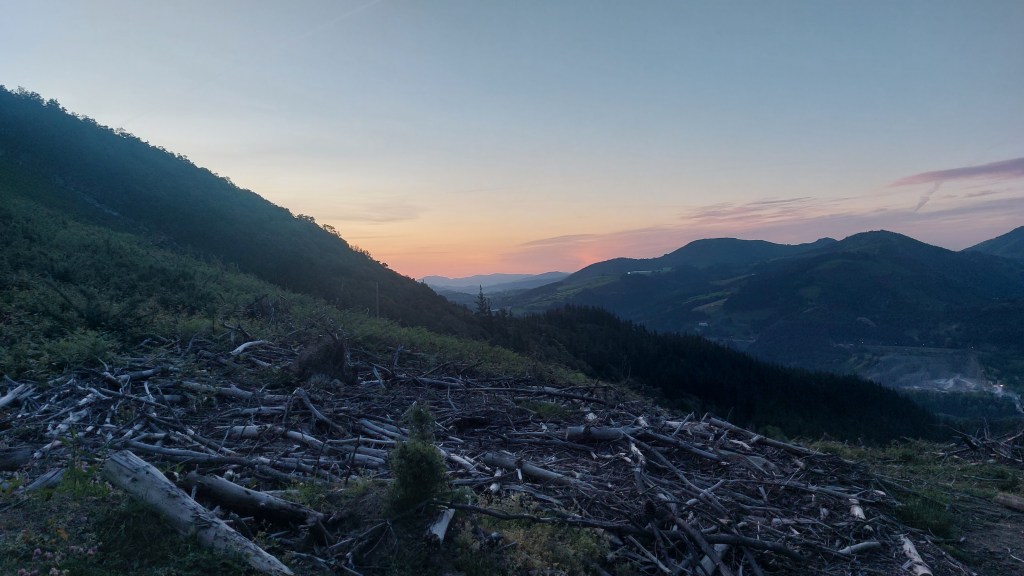 Nous faisons route ensembles jusqu’à Markiren. Ce chemin passe par une sucession de bois, prairies et collines. Nous longeons un géo-parc où vivent des vaches sauvages de race Betizu.