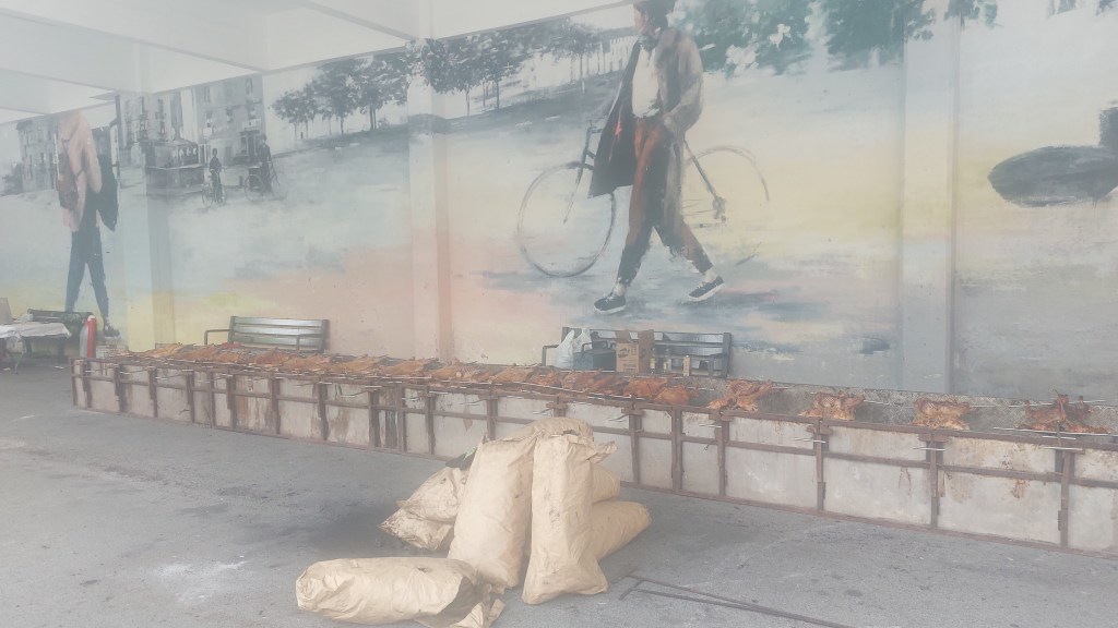 A 12h15, en route pour les quelques kilomètres restants (7), passons devant le marché ;un grand assado où la viande de mouton est gratuite.